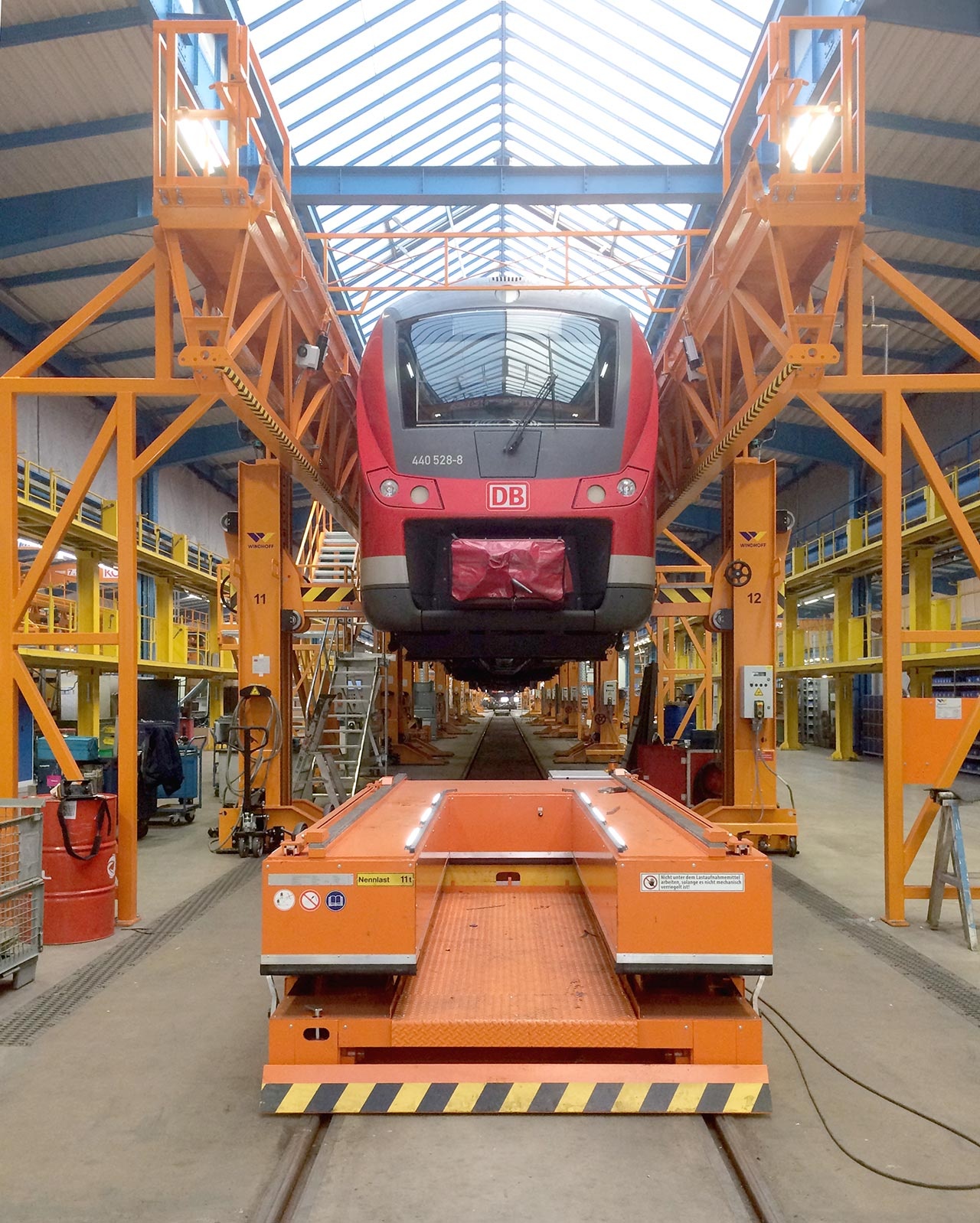An bodenebenen Gleisen setzen wir Drehgestell-Absenkvorrichtungen ein, die in einer Grube quer verfahren. In Kombination mit mobilen Abstützböcken ermöglichen sie einen problemlosen und zeitsparenden Drehgestell-Wechsel, selbst bei verschiedenen Fahrzeugtypen.