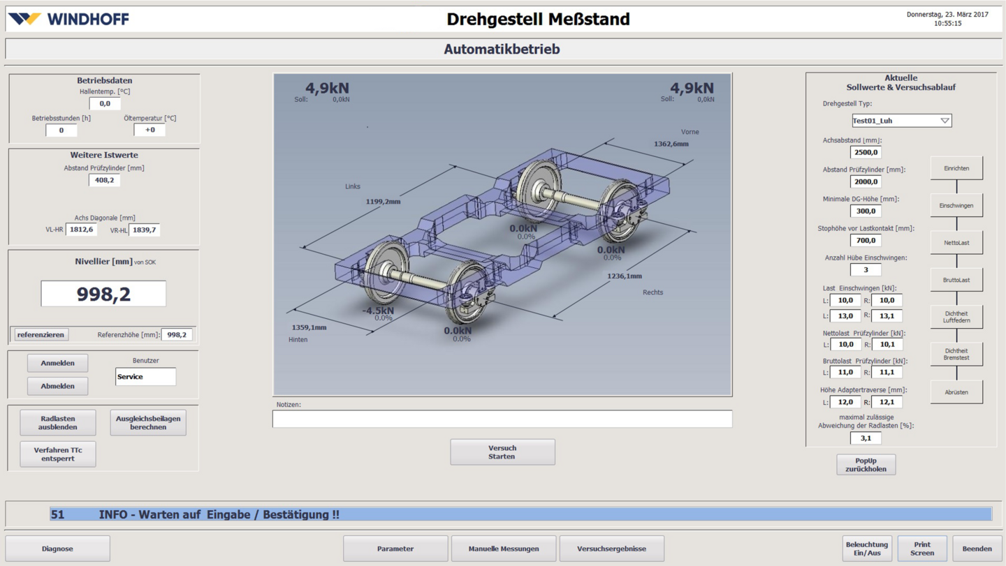 Der Drehgestellprüfstand bietet eine umfangreiche Visualisierung und aussagekräftigen Protokolldruck. Die benutzergeführte Bedienung führt Schritt für Schritt durch den definierten Prüfablauf.