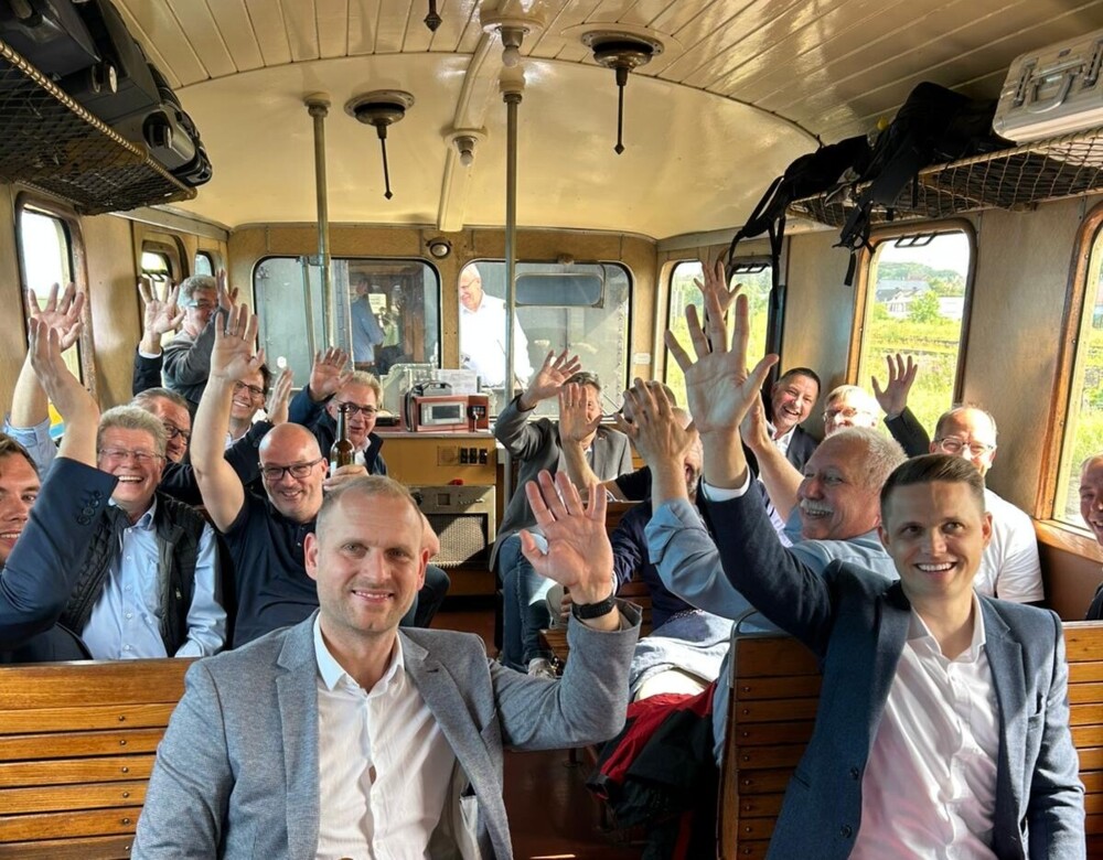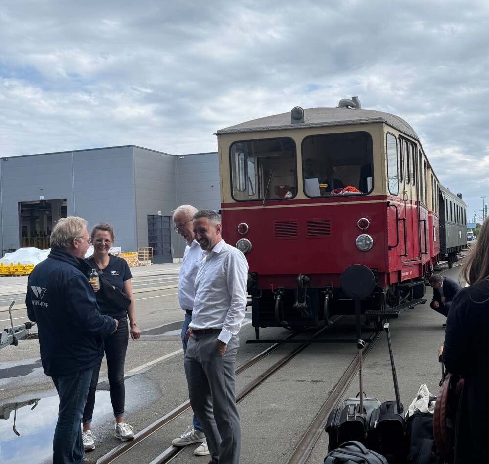 Den Auftakt bildete am Montagnachmittag eine besondere gemeinsame Fahrt im historischen Triebzug VT03 (Baujahr 1985) – von der Fahrzeughalle in Rheine nach Uffeln zur „Mutter Bahr“.